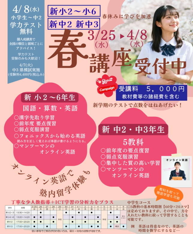 4/8(水) 新小2~新中2 学力テスト(無料)